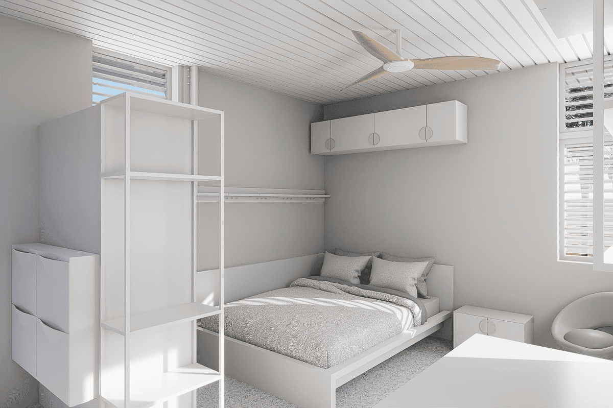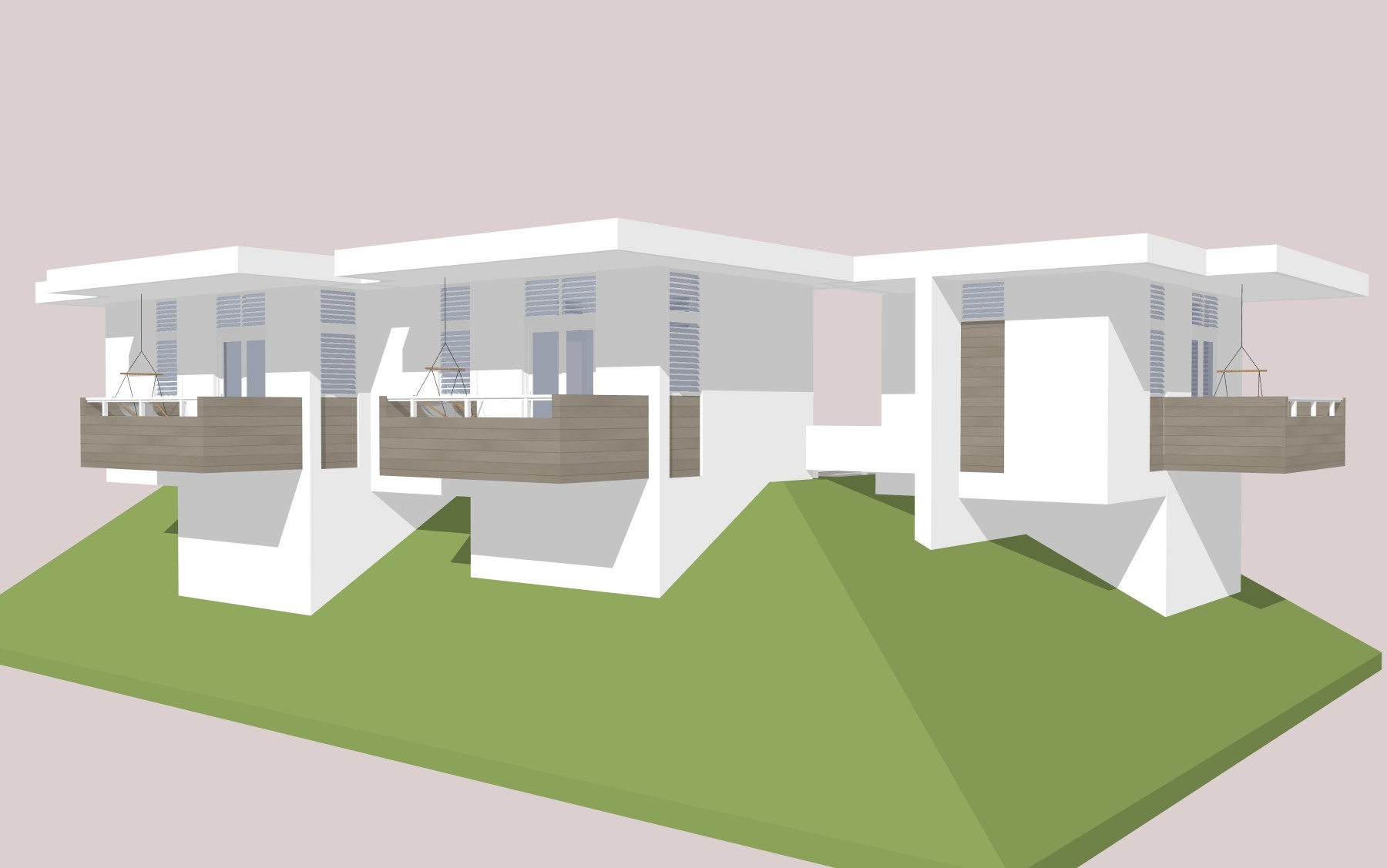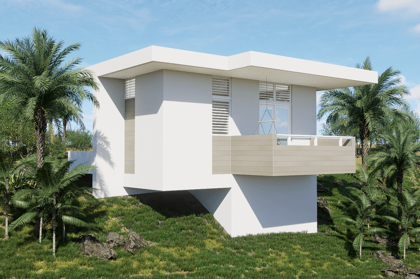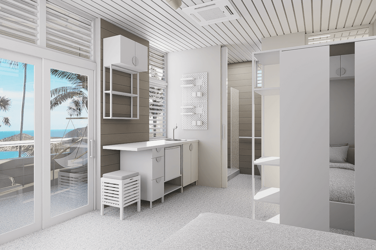 At 200 SQFT this microstructure benefits from a bit more generous lounge area and comprises a sleeping space for a queen bed, Mini bar, 1 bathroom & a covered 115 SQFT deck. It has a self contained cistern for rain water harvesting, a sewage treatment system & a Tesla powerwall solar system. This unit is wonderful for use as a guest house or airbnb and can flex as a 2 person small office or store.
