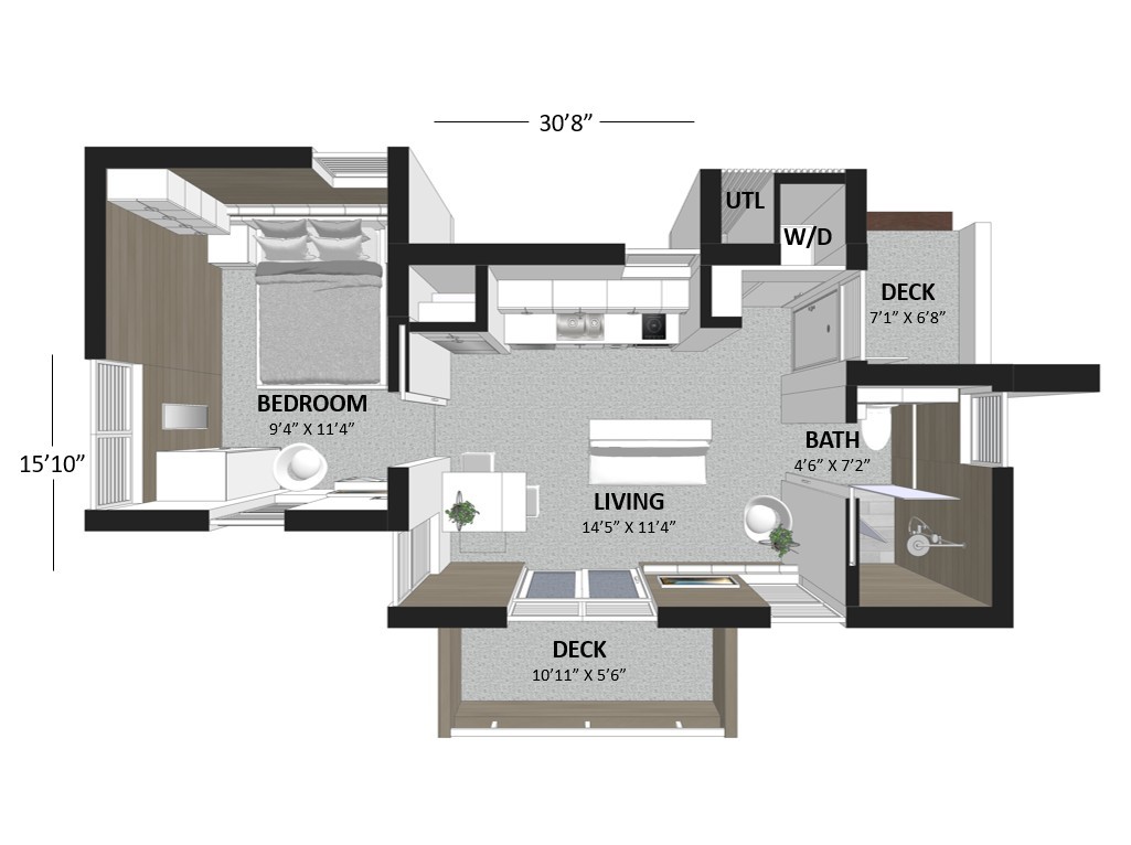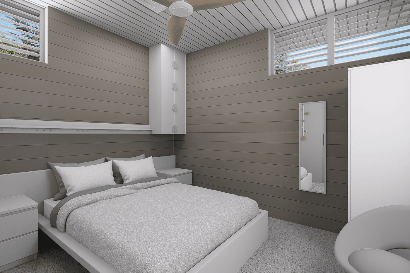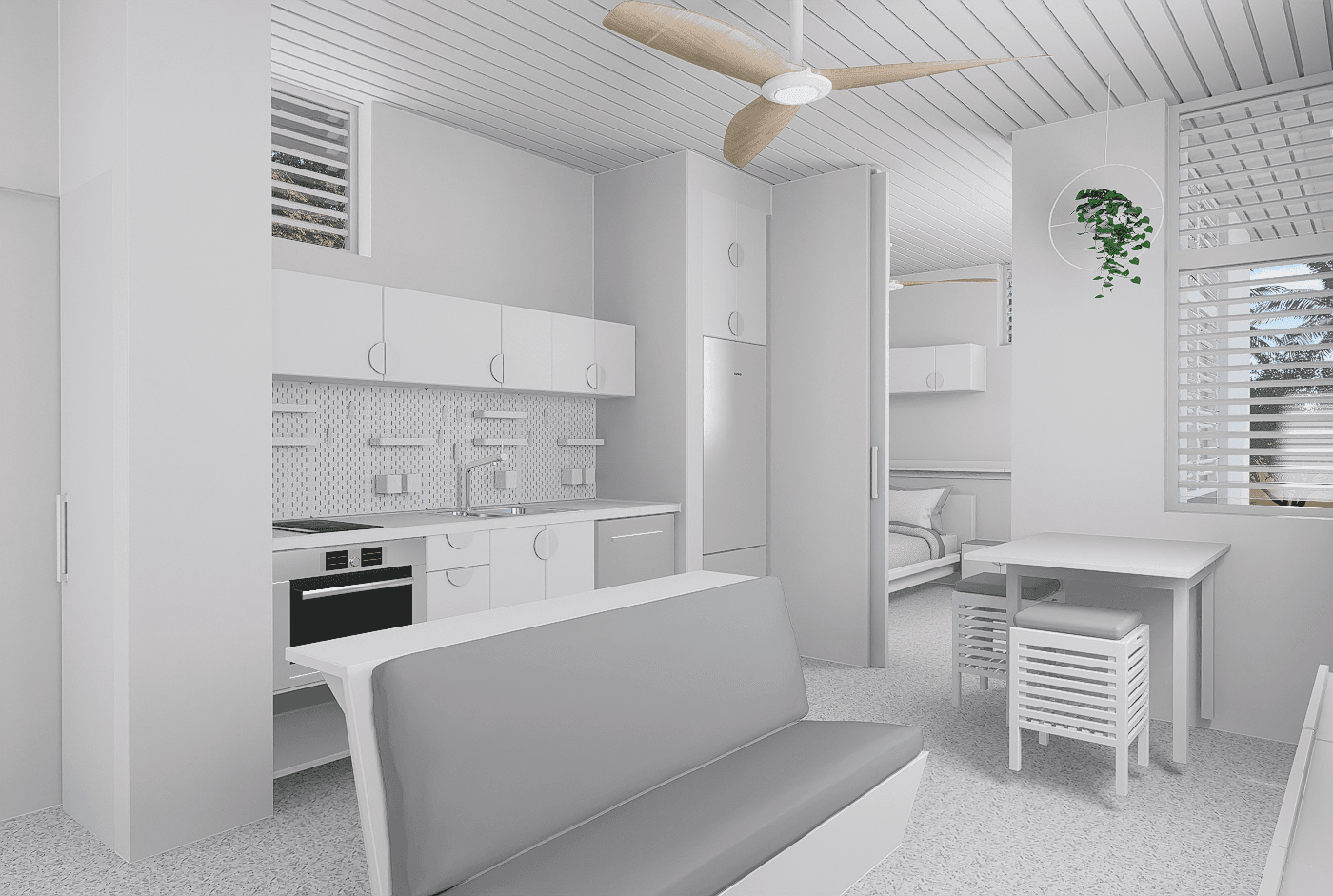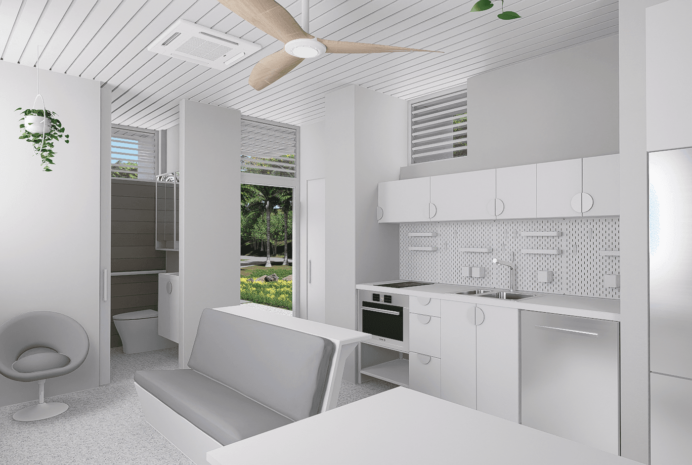 At 300 SQFT this microstructure can be used as a standalone home or attached configurations comprising a queen size bedroom, full kitchen, laundry & 1 bathroom with a covered 115 SQFT deck. It has a self contained cistern for rain water harvesting and a sewage treatment system and a Tesla powerwall solar system. This unit is wonderful for use as a starter home or airbnb and can flex as a 3 person small office or store.