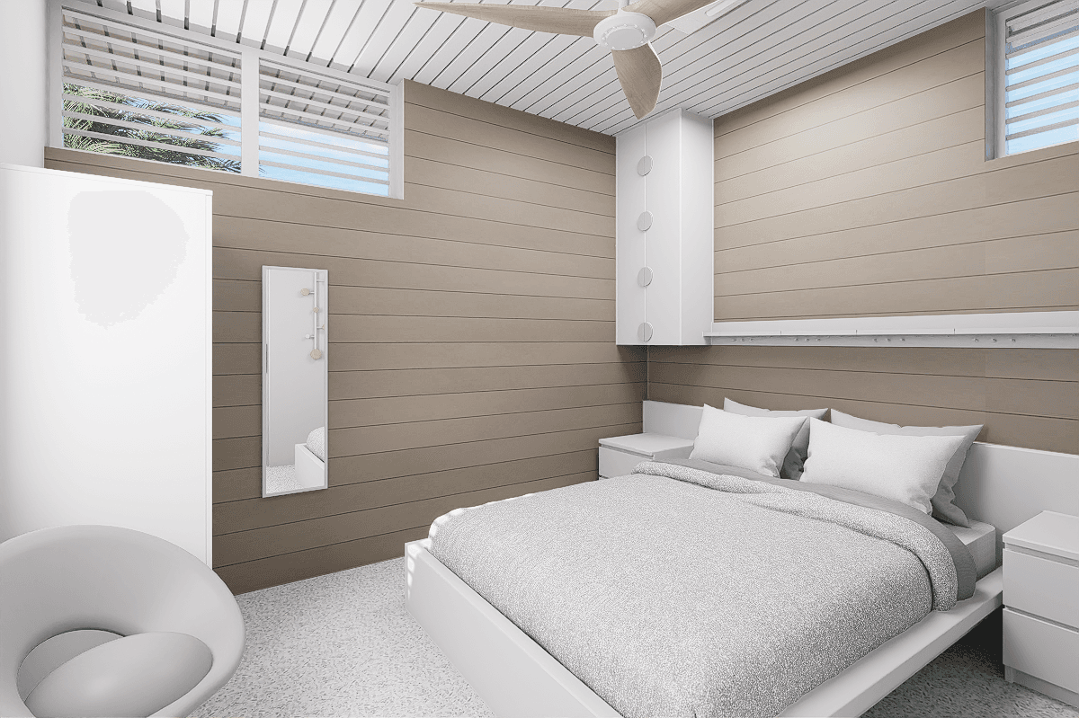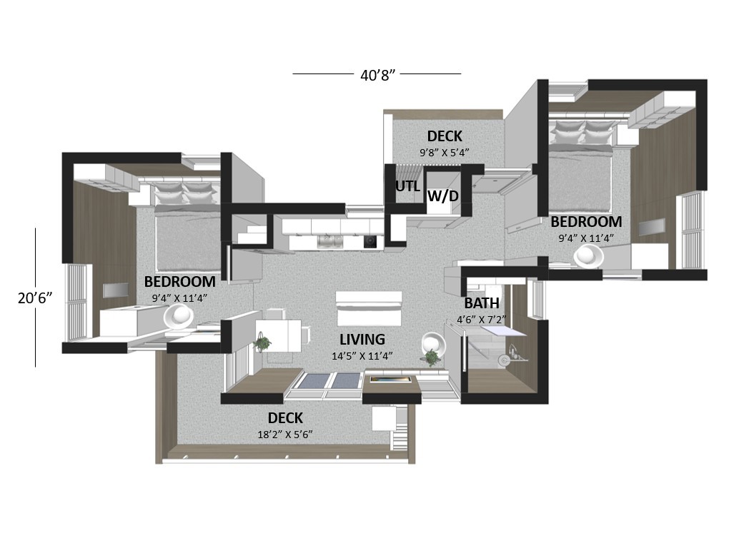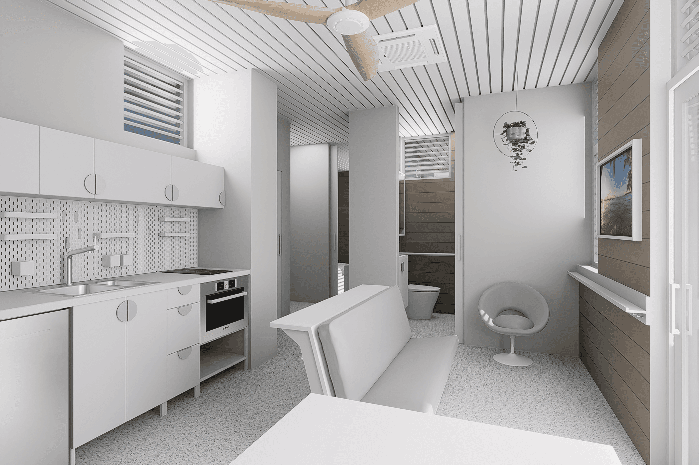 This is our largest microstructure at 400 SQFT comprising a 1 queen & 1 king size bedroom, full kitchen, laundry & 1 bathroom with a partially covered 175 SQFT deck. It has a larger self contained cistern for rain water harvesting and a sewage treatment system and a Tesla powerwall solar system. This unit is perfect starter or retirement home for an couple or a young family. It can also make a great small condo or rental unit.